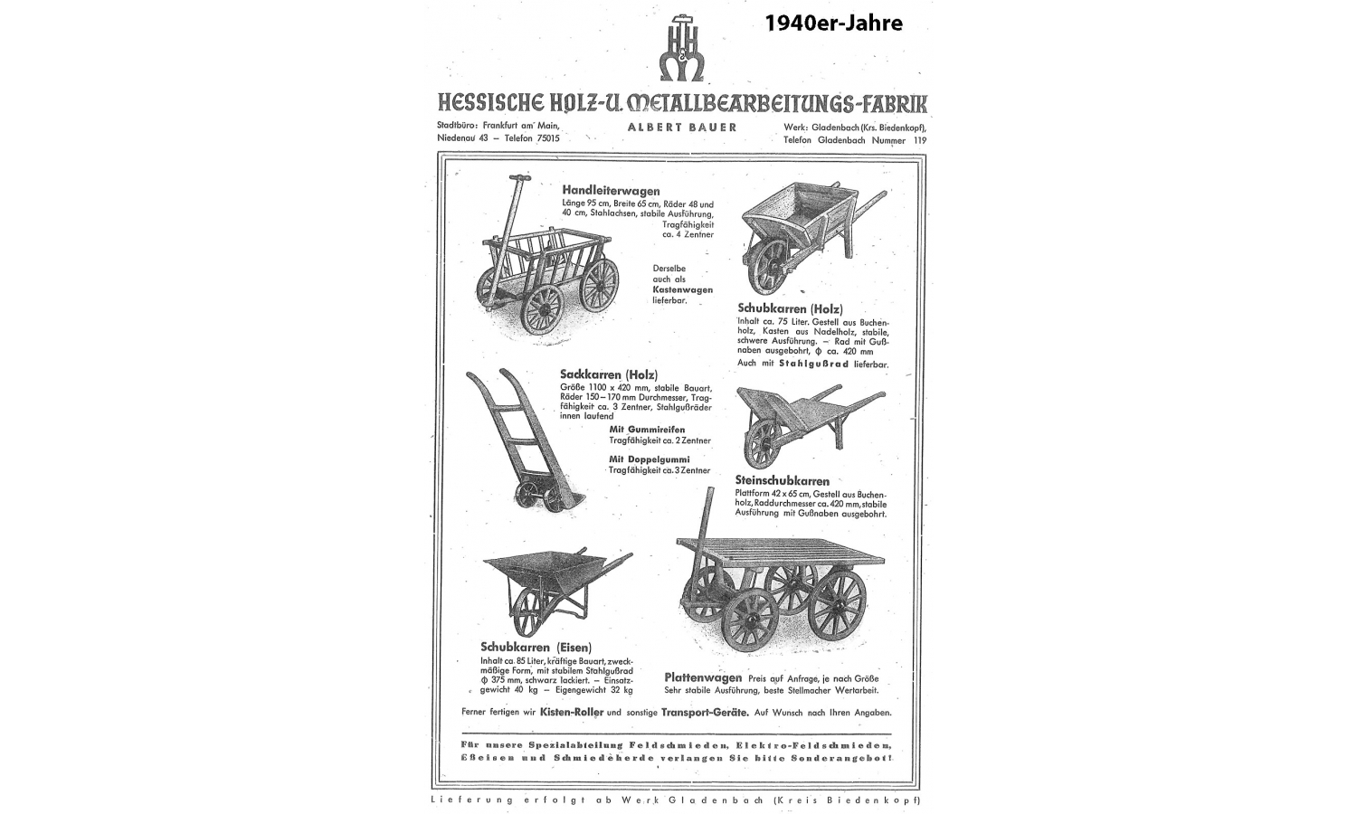 Die Hessische Holz- und Metallbearbeitungs-Fabrik Albert Bauer mit Sitz in Gladenbach im Kreis Biedenkopf (heute Marburg-Biedenkopf) gehörte zu jenen mittelständischen Herstellern, die im frühen 20. Jahrhundert robuste und langlebige Transportgeräte für Landwirtschaft, Gewerbe und Handwerk produzierten. Im Mittelpunkt standen unterschiedliche Hand- und Sackkarren sowie Feldschmieden und Schmiedeherde.